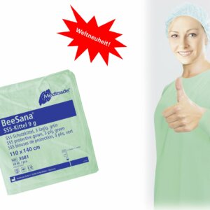 Der BeeSana® SMS-Kittel 40 g wurde erfolgreich auf seine Widerstandsfähigkeit gegen Keimpenetration im feuchten (in Anlehnung an DIN EN ISO 22610) und im trockenen (in Anlehnung an DIN EN ISO 22612) Zustand sowie auf seine Virendichtigkeit (nach DIN EN 14126) geprüft und eignet sich somit hervor-ragend bei Umgang mit MRSA-oder Noroviren.